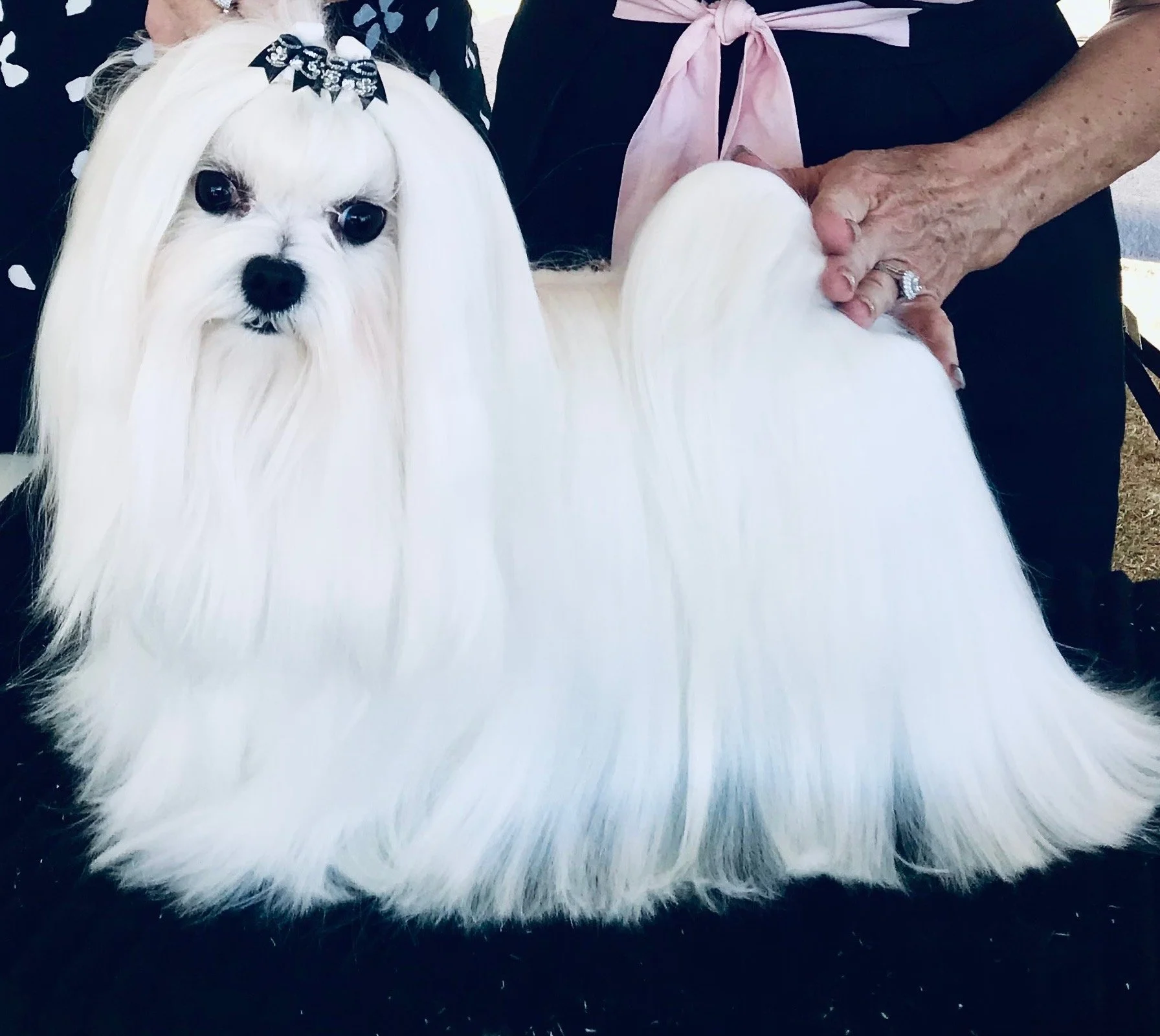 Kenzo Amour is an AKC Champion and the gorgeous sire of our upcoming litter due August 25. He weighs 5 pounds and is such a sweet little man. He is pure white and picture perfect for a Maltese in confirmation and looks. We are now taking names and deposit for our upcoming babies.